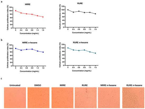 Thus, to test whether the binding with virions affects attachment and penetration, HSV-1 suspension, in the presence of different concentrations of NRRE and RURE n-hexane (0.3 mg/mL, 0.4 mg/mL, and 0.6 mg/mL), was used to infect VERO cells for 1 h at 4 °C. The low temperature allows for binding but not the penetration of the virions inside the cells. The results, reported in Figure 3b, show that NRRE and RURE n-hexane exhibited significant inhibitory activity on the virus binding mainly at 0.6 mg/mL. However, the treatments were unable to completely block viral replication. Images of VERO cells infected and treated with various concentrations of extracts were reported on the right side of Figure 3b.