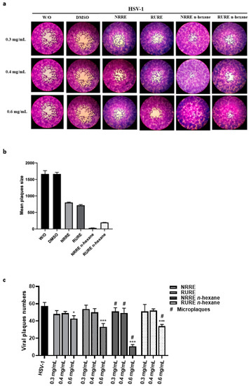 Plaque reduction assay. VERO cells were pre-treated with 0.3 mg/mL, 0.4mg/mL, and 0.6 mg/mL of either NRRE or RURE and either NRRE n-hexane or RURE n-hexane and infected with pre-treated HSV-1 dilutions for 1 h. After 1 h, unabsorbed viral dilutions were aspirated, and the monolayer was covered with medium containing 0.8% methylcellulose in the presence of NRRE, RURE, NRRE n-hexane, or RURE n-hexane at different concentrations (0.3 mg/mL, 0.4 mg/mL, and 0.6 mg/mL) and solvent DMSO. The plaques were stained after 3 days using crystal violet staining and visualized with an inverted microscope (Leica DMIL, Nuβloch, Germany) for plaque morphology detection. In panel (a), the images show the plaque morphological changes, in panel (b) the area of viral plaque size (at 0.6 mg/mL) was measured using ImageJ program and reported in mm2, whereas panel (c) reports the statistical analysis of the plaque’s reduction assay. The data were analysed as the means of triplicates ± SD for each dilution. # indicates microplaques detection and asterisks (* and ***) indicate the significance of p-values less than 0.1 and 0.001, respectively.