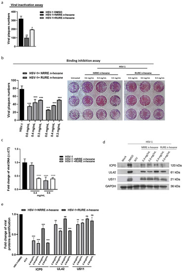 Based on the antiviral activity displayed by NRRE and RURE n-hexane, we aimed to evaluate the mechanism involved in the inhibition of HSV-1 replication. Thus, we tested the effect of both extracts (i) on the inactivation of HSV-1 (Figure 3a); (ii) during the binding of the virus on the cells surface (Figure 3b); (iii) during the viral DNA replication (Figure 3c); and (iv) on viral proteins synthesis (Figure 3d,e). To evaluate the antiviral mechanism mediated by the extracts, we investigated their effect on the virus particles using the viral inactivation assay. We found a marked inhibition of both extracts when pre-incubated for 1 h with the virions (Figure 3a), suggesting that both extracts can bind to virus particles and neutralize virus infectivity.