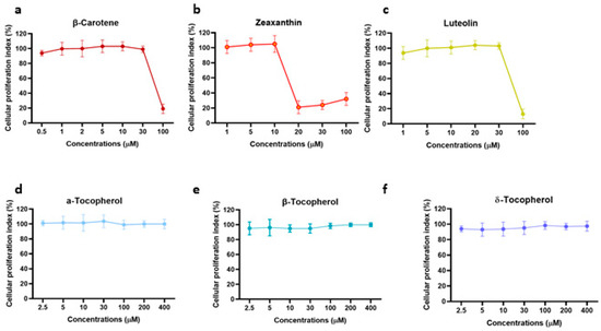 Cell viability of representative pure compounds present in NRRE and RURE n-hexane. (a–f) VERO cells were incubated with different concentrations of β-carotene, zeaxanthin, luteolin, α, β, and δ tocopherol for 72 h. The absorbance was measured at 460 nm, and the % of cell viability was calculated with respect to the untreated cells. Data are expressed as a mean (±SD) of at least three experiments.