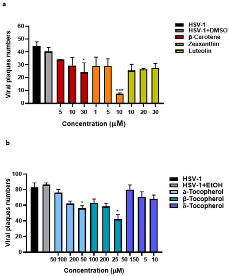 Plaque reduction assay following β-carotene, zeaxanthin, luteolin, α, β, and δ tocopherol treatment. VERO cells were pre-treated with various concentrations of β-carotene, zeaxanthin, luteolin, α, β, and δ tocopherol and infected with pre-treated HSV-1 dilutions for 1 h. After 1 h, the monolayer was covered with a medium containing 0.8% methylcellulose in the presence of single compounds. DMSO and ethanol (EtOH) were used as solvent control. The plaques were visualized after 3 days using crystal violet staining and visualized with an inverted microscope (Leica DMIL, Nuβloch, Germany) for plaque morphology detection. Panel (a) reports the plaque reduction assay following β-carotene, zeaxanthin, and luteolin treatment. Panel (b) reports the reduction of viral plaques following α, β, and δ tocopherol. Results are expressed as mean ± standard deviation (n = 3). * < 0.05 and *** < 0.001.
