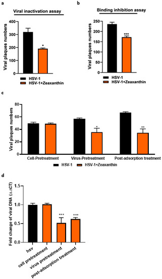 Vero cells were subjected to three different experimental conditions, namely (1) cell pretreatment, (2) virus pretreatment, and (3) post-adsorption treatment. (1) Cell-pretreatment: Vero monolayer cells were pretreated with zeaxanthin at 37 °C for 1 h, after which the medium was replaced with HSV-1 (MOI 1). (2) Virus pretreatment: HSV-1 was pretreated with zeaxanthin at 4 °C for 1 h and then used to infect the VERO monolayers for a further 1 h. (c) Post-adsorption treatment: VERO cells were infected at 37 °C with HSV-1 for 1 h, and zeaxanthin was added after adsorption. In each experimental condition, zeaxanthin (10 µM) was used, and the monolayers were incubated with a medium containing 0.8% methylcellulose in order to visualize the viral plaques after 3 days using crystal violet staining. The infected samples were harvested 24 h post-infection and subjected to viral DNA extraction.