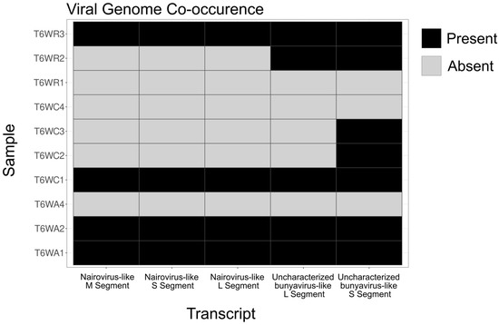 Viral genome occurrence across samples. Occurrence matrix showing the samples in which the putative viral sequences discovered in this study were found. Black boxes indicate that a viral genome segment was present, and grey boxes indicate that a viral genome segment was absent. The full sample occurrence matrix is shown in Figure S2.