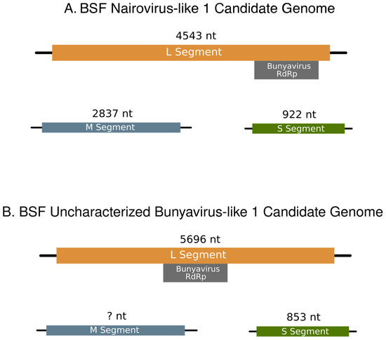 Genome Segments of the two bunyaviruses discovered in this study. (A) The proposed genome of BSF Nairovirus-like 1. The L, M, and S segments are 4543, 2837, and 922 nucleotides, respectively. The bunyavirus RdRp conserved domain lies between nucleotides 3950–4294 (E-value = 2.43 × 10−6) on the L segment. (B) The proposed genome of BSF uncharacterized bunyavirus-like 1. The L and S segments are 5696 and 853 nucleotides, respectively. No transcript met the requirements for an M segment candidate. The bunyavirus RdRp conserved domain lies between nucleotides 2052–2888 (E-value = 1.10 × 10−15) on the L segment.