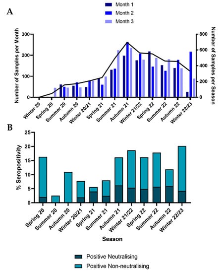 (A) Bar plot showing the number of samples included in the dataset per month on the left y axis. On the right y axis, the total number of samples per season in the dataset is shown as a black line. (B) Stacked bar plot showing the total percentage seropositivity across different seasons. The darker bars depict positive neutralising samples, and the paler stacked bars show positive non-neutralising samples.