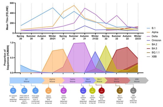 The upper chart shows the mean titre observed in positive neutralising feline samples and is plotted per season. The lower chart shows the proportion of human SARS-CoV-2 sequences identified as different variants over time; human data were obtained via GISAID CoV-Spectrum (GISAID). A timeline showing major events and emergences of new variants in the UK human population is shown at the bottom of this figure.