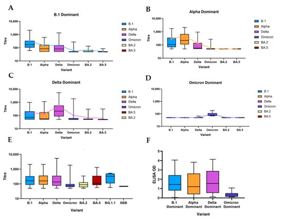 (A) Boxplot of B.1 dominant samples showing median neutralisation titres against different variants. The blue line shows the mean titre against each variant. (B) Boxplot of Alpha dominant samples showing median neutralisation titres against different variants. The orange line shows the mean titre against each variant. (C) Boxplot of Delta dominant samples showing median neutralisation titres against different variants. The purple line shows the mean titre against each variant. (D) Boxplot of Omicron dominant samples showing median neutralisation titres against different variants. The blue line shows the mean titre against each variant. (E) Boxplot showing median neutralisation titres against different variants from every neutralising positive sample. (F) Boxplot showing the median ELISA OD values of each group of variant dominant samples.
