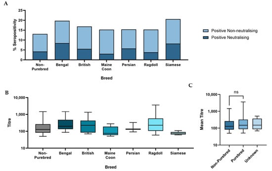 (A) Graph showing the total seroprevalence in different breeds of cat. The darker bars show neutralising seroprevalence and the stacked paler bars show non-neutralising seroprevalence. (B) Boxplot showing the mean titres of neutralising positive cats of different breeds. (C) Boxplot showing the mean titres of the three breed groups. There was no significant difference between the mean titres of purebred and non-purebred cats on a Mann–Whitney test (p = 0.2).