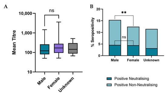 (A) Boxplot showing the mean titres of positive neutralising samples of each sex. It was observed that there was no significant difference between the mean titre of male and female cats using a Mann-Whitney test (p = 0.2). (B) Bar chart showing the total % seropositivity for samples from male and female cats. The darker coloured bars show neutralising seropositivity and the lighter stacked bars show non-neutralising seropositivity. On a Fisher’s Exact test, the difference in total seroprevalence between male and female cats was found to be statistically significant (p = 0.0089) (depicted with an **), however, there was no significant difference between the neutralising seroprevalence of male and female cats (p = 0.8) (depicted as ns).