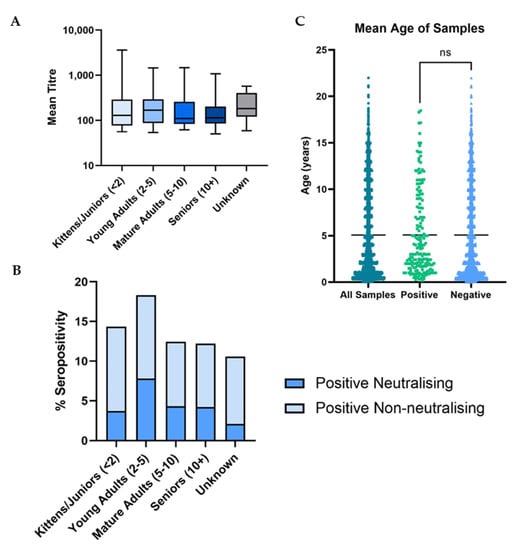 (A) Boxplot showing the mean neutralising titre of samples from cats in different age groups. (B) Bar graph showing total % seropositivity in different age groups. The darker bars show neutralising seroprevalence and the lighter stacked bars show non-neutralising seroprevalence. (C) Scatterplot showing the mean age of sampled cats. Mean age is shown as a black line. There was found to be no significant difference in mean age of cats with positive and negative results (p = 0.12).