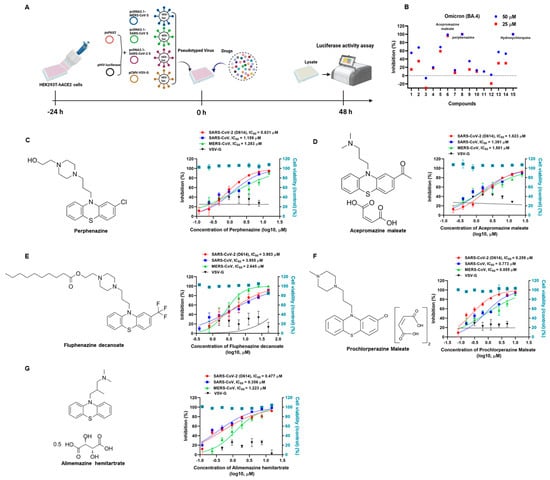 Inhibition of phenothiazines on the infection of SARS-CoV-2, SARS-CoV, and MERS-CoV PsVs. (A) Schematic diagram of pseudotype antiviral assay. To produce pseudovirions, psPAX2 plasmids, and pHIV-Luciferase plasmids were co-transfected into HEK293T cells with pcDNA3.1-MERS-CoV S, pcDNA3.1-SARS-CoV S, pcDNA3.1-SARS-CoV-2 S, and pCMV-VSV-G expressing plasmids, respectively. To discover antiviral drugs, HEK293T-hACE2 cells were incubated with candidate compounds and different pseudoviruses. The cells were lysed and the luciferase activity was assessed 48 h post-infection. (B) Fourteen drugs were selected after the primary screening experiments using the library of US FDA-approved drugs against SARS-CoV-2 Omicron (BA.4) PsV. The inhibition percentages of selected compounds in the PsV assays are shown as 25 μM (blue dots) or 50 μM (red square dots). Hydroxychloroquine was treated as a positive control. (C) The chemical structure of perphenazine and the inhibitory activities of perphenazine against SARS-CoV-2, SARS-CoV, MERS-CoV, and VSV-G PsVs infection. (D) The chemical structure of acepromazine maleate and the inhibitory activities of acepromazine maleate against SARS-CoV-2, SARS-CoV, MERS-CoV, and VSV-G PsVs infection. (E) The chemical structure of fluphenazine decanoate and the inhibitory activities of fluphenazine decanoate against SARS-CoV-2, SARS-CoV, MERS-CoV, and VSV-G PsVs infection. (F) The chemical structure of prochlorperazine maleate and the inhibitory activities of prochlorperazine maleate against SARS-CoV-2, SARS-CoV, MERS-CoV, and VSV-G PsVs infection. (G) The chemical structure of alimemazine hemitartrate and the inhibitory activities of alimemazine hemitartrate against SARS-CoV-2, SARS-CoV, MERS-CoV, and VSV-G PsVs infection. In parallel, the toxicities of these compounds in HEK293T-hACE2 cells were analyzed by the CCK-8 assays (blue squares). Samples were tested in triplicate, and the experiments were repeated at least twice.