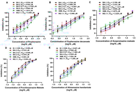 Inhibitory activities of phenothiazines against the infection of pseudotyped SARS-CoV-2 Omicron and its subvariants. (A–E) Efficacy of perphenazine (A), fluphenazine decanoate (B), acepromazine maleate (C), prochlorperazine maleate (D), and alimemazine hemitartrate (E) against BA.1, BA.2, BA.2.12.1, BA.4, XBB, and BQ.1.1 PsVs infection. Samples were tested in triplicate, and the experiments were repeated at least twice. Data are presented in mean ± SD.