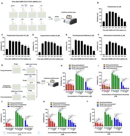 Phenothiazines inhibited SARS-CoV-2 PsV infection at the early stage. (A) Schematic diagram of time-of-addition assay. HEK293T-hACE2 cells were incubated with SARS-CoV-2 PsV (D614), and the candidate compounds at the indicated concentration were added 0.5 h before or 0, 0.5, 1, 2, 4, 6, or 8 h after the addition of the PsV. The cells were lysed 48 h post-infection to determine the entry inhibition efficacy. (B–F) The inhibitory activities of perphenazine (B), fluphenazine decanoate (C), acepromazine maleate (D), prochlorperazine maleate (E), and alimemazine hemitartrate (F) at the indicated time points before or after SARS-CoV-2 PsV infection. (G) Schematic diagram of the three kinds of treatment assays to determine the target of phenothiazines. Drug pretreatment group: HEK293T-hACE2 cells were pre-treated with different concentrations of compounds for 1 h, and then cells were infected with SARS-CoV-2 PsV. Drug-virus co-treatment group: phenothiazines and SARS-CoV-2 PsV were co-incubated at 37 °C for 1 h and then co-treated the cells at the same time. Virus pretreatment group: HEK293T-hACE2 cells were pre-infected with SARS-CoV-2 PsV for 1 h, and then cells were treated with different concentrations of compounds. (H–L) The inhibitory activities of perphenazine (H), fluphenazine decanoate (I), acepromazine maleate (J), prochlorperazine maleate (K), and alimemazine hemitartrate (L) against SARS-CoV-2 PsV infection when treated with different ways. Samples were tested in triplicate, and the experiments were repeated at least twice. Data are presented in mean ± SD. One-way ANOVA followed by Dennett’s multiple-comparison post hoc test was used to detect differences between the groups. p-values below 0.05 (p < 0.05) were considered to demonstrate statistically significant differences. Statistical significance was defined as * p < 0.05, ** p < 0.01, *** p < 0.001.