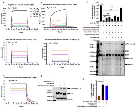 Phenothiazines bound to the spike of SARS-CoV-2 and inhibited its cleavage. (A–E) Purified SARS-CoV-2 S proteins were immobilized on the CM7 sensor chip, and the candidate compounds including perphenazine (A), fluphenazine decanoate (B), acepromazine maleate (C), prochlorperazine maleate (D), and alimemazine hemitartrate (E) with different concentrations (from 7.18 to 250 μM) flowed over it for the SPR. The KD values were analyzed by Biocore Insight Evaluation Software. (F) The inhibitory activities of phenothiazines on CTSL-mediated S protein cleavage. Purified CTSL protein was incubated with or without candidate compounds on ice for 15 min, then S protein was added and incubated at 37 °C for 1 h. Proteins were subjected to silver staining. The expression of the full-length protein was quantitated by measuring band intensities using ImageJ software (version 1). Teicoplanin was used as a positive control. (G,H) Prochlorperazine maleate or teicoplanin was co-incubated with SARS-CoV-2 PsV at 37 °C for 1 h prior to being added to the HEK293T-hACE2 cells. The spike protein level was detected by Western blotting (G). The expression of the full-length protein was quantitated by measuring band intensities using ImageJ software (H). The values were normalized to β-actin. Data are presented as means ± SD. p-values below 0.05 (p < 0.05) were considered to demonstrate statistically significant differences. Statistical significance was defined as * p < 0.05, ** p < 0.01, *** p < 0.001.
