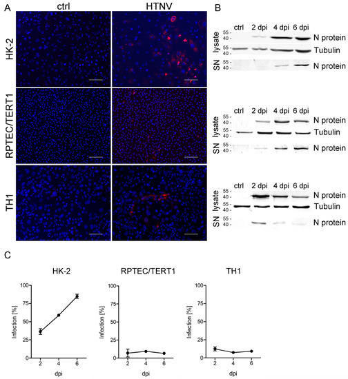 Infection of tubular epithelial cell lines with Hantaan virus (HTNV). Cells were inoculated with HTNV, and infection was monitored by detection of nucleocapsid protein (N protein) by (A) immunofluorescence and (B) Western blot analysis of cellular lysates and cell-free supernatants (SN). Shown is a representative image at six days post infection (dpi). Scale bar: 100 µm. (C) Percentage of infected cells was quantified by counting cells expressing N protein. Three independent experiments were performed. Mean and standard deviation (±SD) are shown.