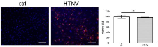 Viability of HTNV-infected HK-2 cells. The viability of HTNV-infected cells was tested at six dpi. Infection was monitored by staining of N protein and more than 95% of cells were infected. Scale bar: 100 µm. The viability of uninfected cells was set to 100%. Three independent experiments were performed. Mean ± SD is shown.