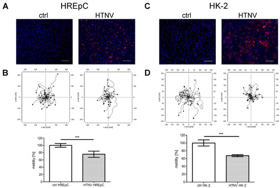 Motility of HTNV-infected human primary epithelial cells (HREpCs) and HK-2 cells. (A,C) Infection of cells was monitored by immunostaining of N protein. (B,D) Migration of 30 infected and uninfected cells was analyzed in each experiment. Experiments were performed at six dpi with more than 95% of cells being infected as demonstrated by detection of N protein expression via immunofluorescence. Scale bar: 100 µm. Three independent experiments were performed. Motility of uninfected cells was set to 100%. Shown is mean ± SD. *** p < 0.0001.