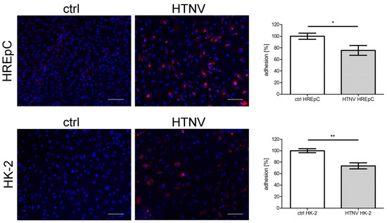 Adhesion of HTNV-infected HREpCs and HK-2 cells. Adhesion of uninfected and infected HREpCs and HK-2 cells was analyzed. Experiments were performed at six dpi with more than 95% of cells being infected as demonstrated by detection of N protein expression by immunofluorescence. Scale bar: 100 µm. Three independent experiments are performed. Adhered uninfected cells were set to 100%. Shown is mean ± SD. * p < 0.05; ** p < 0.005.