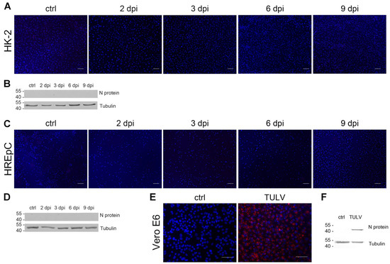 Infection of HK-2 cells and HREpCs with Tula virus (TULV). Cells were inoculated with TULV at an MOI of 1. Cells were analyzed for the expression of N protein by (A,C) immunofluorescence and (B,D) Western blot. TULV-infected Vero E6 cells served as positive control for the detection of N protein by (E) immunofluorescence staining and (F) Western blot analysis. Scale bar: 100 µm.