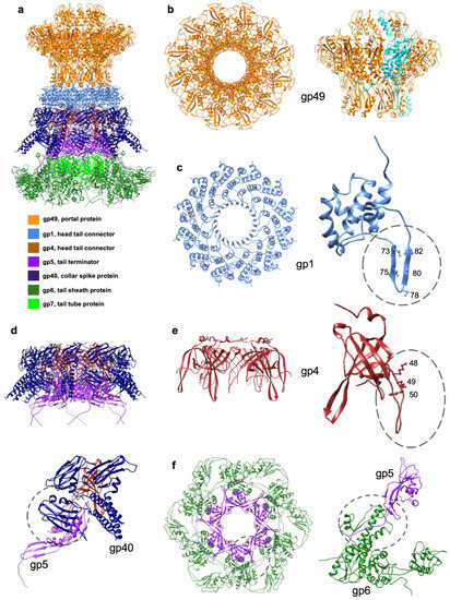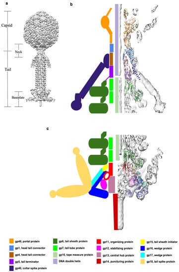 - Iwasaki, T.; Yamashita, E.; Nakagawa, A.; Enomoto, A.; Tomihara, M.; Takeda, S. Three-dimensional structures of bacteriophage neck subunits are shared in Podoviridae, Siphoviridae and Myoviridae. Genes Cells 2018, 23, 528–536. [Google Scholar] [CrossRef]