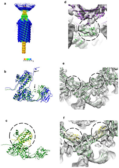 - Fokine, A.; Zhang, Z.; Kanamaru, S.; Bowman, V.D.; Aksyuk, A.A.; Arisaka, F.; Rao, V.B.; Rossmann, M.G. The Molecular Architecture of the Bacteriophage T4 Neck. J. Mol. Biol. 2013, 425, 1731–1744. [Google Scholar] [CrossRef]