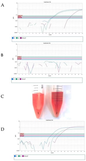 - Jaeger, L.H.; Nascimento, T.C.; Rocha, F.D.; Vilela, F.M.P.; Duque, A.P.N.; Silva, L.M.; Riani, L.R.; Moreira, J.P.; Chagas, J.M.D.A.; Pereira, T.V.; et al. Adjusting RT-qPCR conditions to avoid unspecific amplification in SARS-CoV-2 diagnosis. Int. J. Infect. Dis. 2021, 102, 437–439. [Google Scholar] [CrossRef] [PubMed]