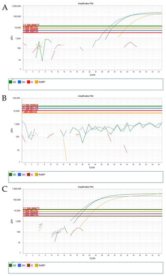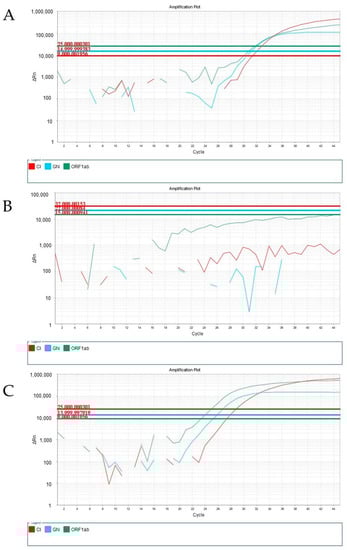 Amplifications of different samples containing SARS-CoV-2 (via RT-qPCR) analyzed using the Biomol OneStep COVID-19 (IBMP) Kit. (A) Amplification curve of the sample obtained in June 2021, corresponding to the Alpha, Beta, Gamma, or Delta variants. (B) Amplification curve of the undiluted sample, obtained in January 2022, probably corresponding to the Omicron variant. (C) Amplification curve of the same sample as in B, to which a pre-dilution with saline at a 1:2 ratio (1 sample: 2 saline) was applied.