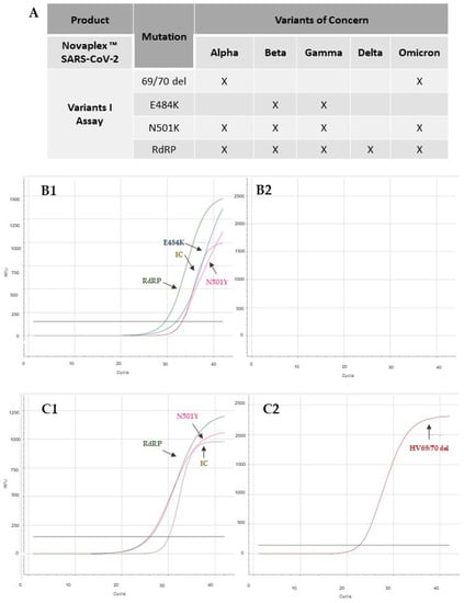 Analysis and differentiation of SARS-CoV-2 variants. (A) Detection and differentiation of mutations according to the Novaplex™ SARS-CoV-2 Variants I Assay kit. (B) Representative result of a sample from September 2021, with amplification of the E484K gene and others, indicating that it is the Beta or Gamma variant sample (B1), and without amplification of the HV69/70 del mutation gene (B2), indicating that it is not the Omicron variant. (C) Representative result of a sample from January 2022, with amplification of the N5011Y and 69/70 del mutation genes (C1,C2), indicating that it is the Omicron variant.