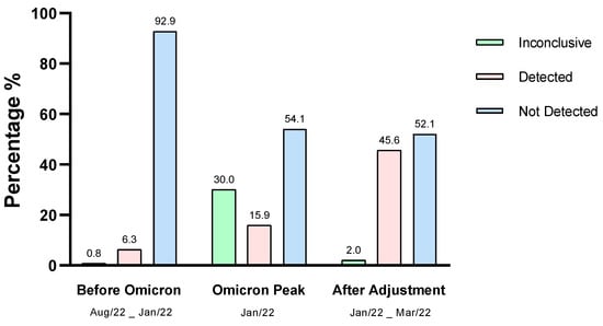Further, we conducted a reassessment of three thousand (3000) diagnostic test results from August 2021 to March 2022 to confirm the impact of the emergence of the Omicron variant on RT-qPCR analysis and the effect of pre-dilution of the biological sample. The tests covered three periods: pre-Omicron variant, peak prevalence of the Omicron variant without sample pre-dilution, and after adjustment of the protocol for the Omicron variant. In the period before the emergence of the Omicron variant, the rate of inconclusive results was 0.83%. However, after the appearance of the Omicron variant in January 2022, this rate significantly increased to 30.0%. Nonetheless, after adjusting the protocol for nucleic acid extraction and re-establishing control gene amplification, the inconclusive results rate dropped to 2.0%. This indicates that pre-dilution of the biological sample can decrease interferences in the RT-qPCR assay, resulting in a significant reduction in inconclusive results (Figure 5).
