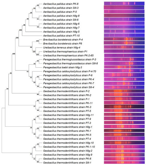 In total, 41 different bacterial strains were isolated during this study based on the results of morphological, physiological, and genetic analysis (Table S1). Genetic analysis was based on the comparison of PCR-amplified 16S rRNA gene fragment sequences. In addition, BOX-PCR, which can be applied for molecular typing within the Geobacillus genus [35], was performed (Figure 1). It was demonstrated that all isolated thermophilic bacteria are the members of phylogenetically closely related genera: Geobacillus (nineteen strains), Aeribacillus (nine strains), Parageobacillus (eight strains), Ureibacillus (three strains) and Brevibacillus (two strains).