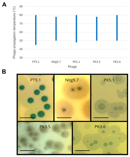 To determine the optimal conditions for phage propagation, the effect of temperature on the efficiency of plating (e.o.p.) was examined in the temperature range of 40–85 °C (Figure 3A). It was demonstrated that phages NIIg9.7 and PK3.5 infected their host cells from 50 to 78 °C. Moreover, PT9.1, PK5.1, and PK3.6 formed plaques even at 80 °C, and the lowest temperatures for their infectivity are 45, 48, and 50 °C, accordingly. In addition, all phages formed plaques with a clear center surrounded by an opaque halo zone (Figure 3B). Phage NIIg9.7 formed plaques with the largest halo zones; after one day of incubation at 55 °C, these were up to 11.42 ± 0.75 mm in diameter (Table 1, Figure 3B). As it was mentioned previously, all tested host strains demonstrated limited growth in liquid LB medium; thus, it was not possible to perform the adsorption test and/or single-step experiments under the investigated conditions.