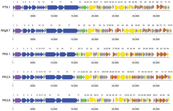 The summary of general genomic features of the isolated phages is shown in Table 2. All bacteriophages contained double-stranded DNA genomes varying from 38,161 bp (phage PK5.1) to 39,016 bp (phage NIIg9.7). Phages possessed genomes with a GC content from 43.5% (phage PK3.5) to 44.8% (phage PK3.6), which were insignificantly lower than that (48.8–53.1%) observed for Geobacillus species [38]. Similar to other dsDNA bacteriophages, the genomes of thermophilic phages were close packed—92.0% (phage PK3.6) to 94.2% (phage PT9.1) of the genomes were coding. The analysis of the genome sequences revealed that a number of predicted ORFs encoding for proteins ranged from 64 (phage PK5.1) to 76 (phages NIIg9.7 and PK3.5), but no open reading frames encoding for tRNAs were identified (Table 2; Tables S4–S8). Notably, an apparent asymmetry in the distribution of the genes on the two DNA strands of phages was observed. With the exception of ORF40 encoding a ribbon–helix–helix domain-containing protein from phage NIIg9.7, all other ORFs have been predicted to be transcribed from the same DNA strands (Figure 4).