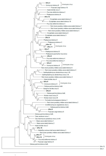 The phylogenies were based on predicted RdRp protein sequences. Since Ufvs_18, Ufvs_19, and Ufvs_20 did not yield an ORF for an RdRp, they were not included in the analysis.