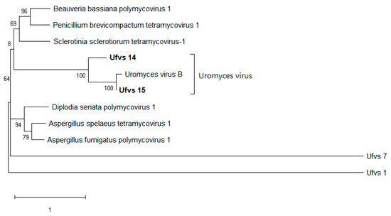 Polymycoviruses of U. fabae (Ufvs_14, Ufvs_15) in relation to their close relatives–evolutionary analysis using maximum likelihood method. The tree with the highest log likelihood (-9260.88) is shown. The percentage of trees in which the associated taxa clustered together is shown next to the branches. The tree is drawn to scale, with branch lengths measured in the number of substitutions per site. The analysis involved 11 RdRp sequences. All positions with less than 60% site coverage were eliminated, i.e., fewer than 40% alignment gaps, missing data, and ambiguous bases were allowed at any position (partial deletion option). There were a total of 482 positions in the final dataset. Ufvs_7 and Ufvs_1 were included as outgroups, representing totiviruses and tobamo-like viruses, respectively.