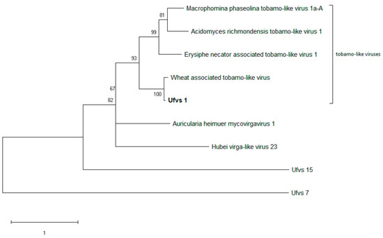 Ufvs_1 and its close relatives–evolutionary analysis using maximum likelihood method. The tree with the highest log likelihood (-8123.81) is shown. The percentage of trees in which the associated taxa clustered together is shown next to the branches. The tree is drawn to scale, with branch lengths measured in the number of substitutions per site. This analysis involved 9 RdRp sequences. All positions with less than 60% site coverage were eliminated, i.e., fewer than 40% alignment gaps, missing data, and ambiguous bases were allowed at any position (partial deletion option). There were a total of 449 positions in the final dataset. Ufvs_7 and Ufvs_15 were included as outgroups, representing totiviruses and polymycoviruses, respectively.