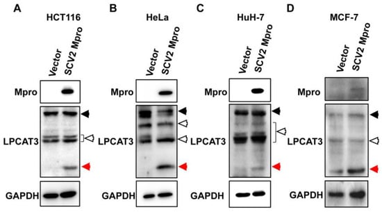 SARS-CoV-2 infects various cell types causing different symptoms [5,34,35]. The crosstalk between viral proteases and host proteins is diverse in different cell types. To test whether SARS-CoV-2 Mpro would induce LPCAT3 cleavage in all types of cells, pcDNA3.1-SCV2 Mpro was used to transfect a series of cell lines, including human colorectal cancer-derived HCT116 cells (Figure 2A), human cervical cancer-derived HeLa cells (Figure 2B), human hepatocellular cancer-derived HuH-7 cells (Figure 2C), and human breast cancer-derived MCF-7 cells (Figure 2D). LPCAT3 expression was detected in all tested cells (Figure 2). As expected, cleaved LPCAT3 was found in all tested cells with exogenous SARS-CoV-2 Mpro expression, even though the expression level of Mpro was low in MCF-7 cells because of the poor transfection efficiency (Figure 2). It demonstrated that the SARS-CoV-2 Mpro-induced LPCAT3 cleavage was independent of cell types.