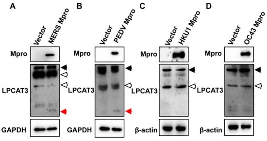 Mpro from highly virulent coronaviruses caused LPCAT3 cleavage. HEK293T cells were transfected with recombinant plasmids encoding various coronaviral Mpro, respectively. Cellular lysates were harvested and submitted to Western blot 24 h later. (A) MERS-CoV. (B) PEDV. (C) HCoV-HKU1. (D) HCoV-OC43. The black solid arrows present uncleaved-LPCAT3, the red arrows present cleaved-LPCAT3, and the black hollow arrows present non-specific bands.