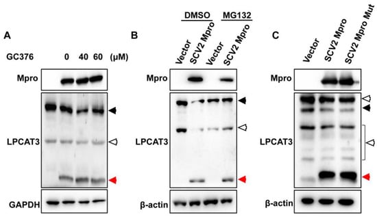The Mpro protein is highly conserved and cleaves similar motifs. However, the Mpro of SARS-CoV-2, MERS-CoV, and PEDV could induce LPCAT3 cleavage (Figure 1 and Figure 3), but the Mpro of HCoV-OC43 and HCoV-HKU1 could not (Figure 3). It hinted that the Mpro-induced cleavage of LPCAT3 might be indirect. GC376 was reported to covalently inhibit SARS-CoV-2 Mpro [37]. However, adding GC376 into the culture medium failed to abolish Mpro-induced LPCAT3 cleavage (Figure 4A). Afterwards, the proteasome is the major protein degradation machinery in eukaryotic cells [38]. MG132 was a promised reversible proteasome inhibitor, which had been proven to inhibit SARS-CoV-2 Mpro in our early studies [39]. Unexpected, Mpro-induced LPCAT3 cleavage was still observed in the presence of MG132 (Figure 4B), suggesting a proteasome-independent cleavage. Moreover, the 41st amino acid residue histone and the 145th amino acid residue cysteine of Mpro formed a catalytic dyad to hydrolyze substrates. To confirm that the catalytic activity of Mpro was not required for LPCAT3 cleavage, a Mpro mutant was constructed, in which the His41 was replaced by tyrosine and the Cys145 was replaced by serine as previously described [40]. Not surprisingly, Mpro mutation still induced LPCAT3 cleavage as well as wild-type SARS-CoV-2 Mpro (Figure 4C). Altogether, it clearly indicated that Mpro indirectly induced LPCAT3 cleavage.