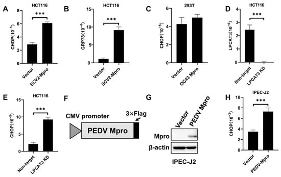 PEDV caused severe diarrhea in piglets, and notable gastrointestinal symptoms have been observed in 20–50% of patients infected with SARS-CoV-2 and MERS-CoV. It suggests that the gastrointestinal tract is an unignorable organ during coronaviral infection. LPCAT3 preferentially introduces polyunsaturated acyl onto the sn-2 position of lysophosphatidylcholine, modulating the membrane fluidity and playing an important role in lipoprotein production in the liver and intestine [26]. In addition, LPCAT3 knockdown in the liver exacerbated ER stress and inflammation [28]. Then, would Mpro-induced LPCAT3 cleavage induce ER stress in the intestine cells? Exogenous SARS-CoV-2 Mpro was expressed in HCT116 cells, which would induce LPCAT3 cleavage (Figure 2A). The C/EBP homologous protein (CHOP) expression was obviously higher in cells transfected with pcDNA3.1-SCV2 Mpro compared to cells transfected with empty vectors (Figure 5A). GRP78, another ER stress marker, was also increased in cells expressing exogenous SARS-CoV-2 Mpro (Figure 5B). Interestingly, HCoV-OC43 Mpro failed to induce LPCAT3 cleavage (Figure 3D), which did not boost the CHOP expression (Figure 5C). An increased CHOP expression was found when the LPCAT3 expression was knocked down by siRNA (Figure 5D,E). It demonstrated that Mpro-induced ER stress was related to LPCAT3 cleavage. Moreover, IPEC-J2 cells are porcine intestinal enterocytes, which are hard to transfect. A lentiviral vector encoding the PEDV Mpro was constructed to transduce IPEC-J2 cells (Figure 5F). PEDV Mpro was successfully and stably expressed in IPEC-J2 cells (Figure 5G) and increased CHOP mRNA was observed (Figure 5H).