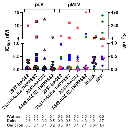 Figure 1. Neutralization of pLV and pMLV particles by mAbs as measured by neutralization assays in 293T and A549 cells expressing ACE2 with and without TMPRSS2 and binding of the mAbs to SARS-CoV-2 Wuhan (blue), Delta (red), and Omicron (green) variants by ELISA and SPR assays. Various symbols are used to distinguish different assays. For Wuhan and Delta variants, the mean IC50 [nM] and KD [nM] values are calculated based on the data from all five mAbs for neutralization/ELISA and SPR assays, respectively. For Omicron variant, the IC50 [nM] and KD [nM] values are indicated for the GenScript standard only.