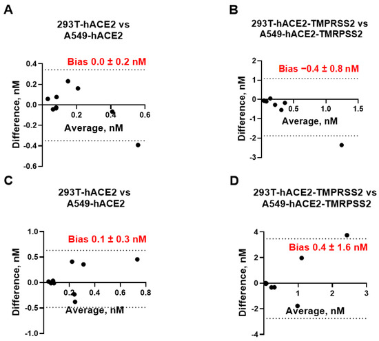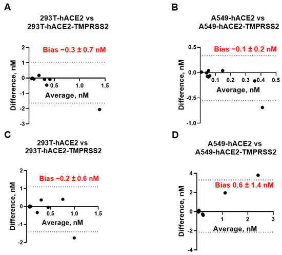 Figure 2. Bland–Altman plots showing equivalency of neutralization assays performed in 293T-hACE2 vs. 293T-hACE2-TMPRSS2 cells (A,C) or A549-hACE2 vs. A549-hACE2-TMPRSS2 cells (B,D) using pLV (A,B) or pMLV (C,D) particles. Bias [nM] between each pair of neutralization assays is indicated. Dashed lines represent 95% confidence interval (CI) for bias.