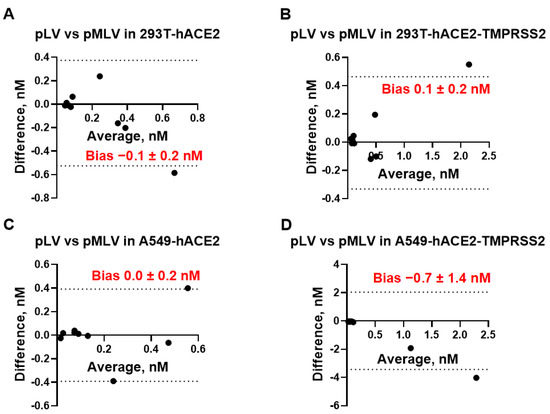 Figure 4. Bland–Altman plots showing equivalency of neutralization assays using pLV vs. pMLV particles and performed in 293T-hACE2 (A), 293T-hACE2-TMPRSS2 (B), A549-hACE2 (C), and A549-hACE2-TMPRSS2 cells (D). Bias [nM] between each pair of neutralization assays is indicated. Dashed lines represent 95% confidence interval (CI) for bias.