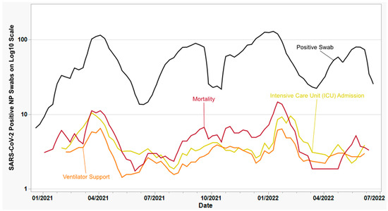 Figure 1 depicts a 3-week moving average of the total number of SARS-CoV-2-positive NP swabs selected for this study, superimposed over the three primary clinical outcomes observed (ICU admission, ventilator support, and mortality). The CDI received a total of 10,431 positive swabs during this period, obtained from 9 hospitals located throughout our network, of which 3261 were related to vaccine-breakthrough infections; the remaining 7170 swabs were classified as “routine”. The majority (n = 3586) of positive NP swabs were screened initially using real-time RT-PCR, and only specimens with a Ct value ≤ 39 were selected for further analysis using the variant screening assay; the remaining samples (n = 1421) were not pre-screened. For the purposes of this study, only successfully screened swabs with clinical outcome data were included in the final dataset, corresponding to 3430 routine swabs and 1577 vaccine-breakthrough swabs (total = 5007).