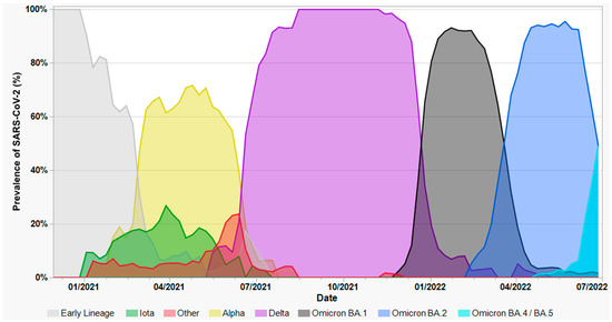 Figure 2 depicts the chronological succession of variant “waves” observed in this study, derived from the combined results of variant screening and WGS. Multiple pre-variant lineages circulated during 2020 and the first few months of 2021, with Iota and Alpha both emerging in January 2021. The latter two predominated for the first half of 2021, punctuated by a handful of other variants, including Gamma and Mu, but were displaced by the emergence of Delta in May 2021. From August to November 2021, Delta sub-lineages accounted for nearly 100% of all swabs, only to be displaced beginning in December 2021 by successive waves of Omicron sub-lineages. Although the timeframe encompassed by this study only extends through June 2022, this dynamic continues, characterized primarily by sub-variants of BA.5 (e.g., BQ.1.1) and BA.2 (e.g., XBB.1.5).