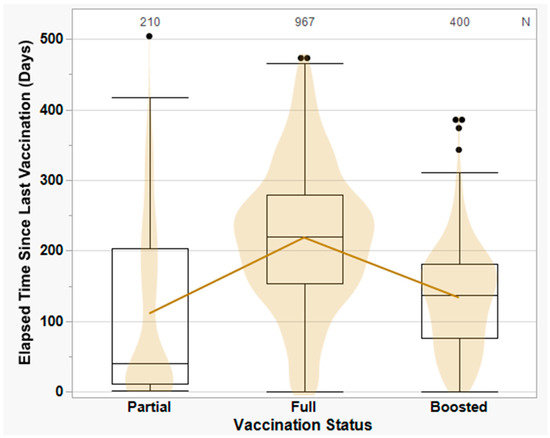 Number of days to positive SARS-CoV-2 diagnosis since the last COVID-19 vaccine dose received, stratified by number of vaccine doses (regardless of vaccine brand). Numbers at the top of the figure denote the number of study subjects receiving a particular number of vaccine doses; black points represent outliers. “Partial” refers to a single dose of either Pfizer (n = 116) or Moderna (n = 94) mRNA vaccine; “full” refers to two doses of Pfizer (n = 498) or Moderna (n = 348) or one dose of Janssen (n = 121); and “boosted” refers to any additional doses of Pfizer (n = 198), Moderna (n = 174), or both (n = 28). Trendline denotes the mean number of days to positive SARS-CoV-2 diagnosis, while horizontal lines inside the boxplots denote the median number of days (41 days partially vaccinated, 220 for fully vaccinated, and 138 for boosted).
