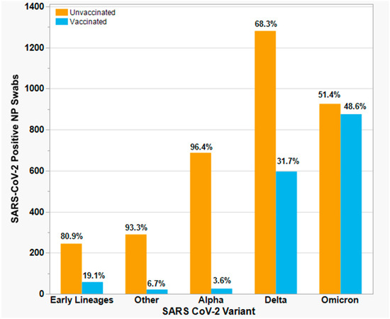 No significant differences were observed among variants or sub-variants infecting vaccinated vs. unvaccinated individuals, with the exception of Alpha (p < 0.001) and pre-variant lineages (p < 0.001), both of which coincided with the first few months of the vaccination campaign (Table S1). Vaccinated individuals accounted for a higher proportion of individuals infected with Omicron BA.1 and BA.2 variants, but this difference was not significant. A notable increase in vaccine-breakthrough swabs was observed in August 2021, continuing during the periods of Delta and Omicron predominance (despite an increasing likelihood of being vaccinated over time). During the Omicron period, 48.6% (876/1802) of all positive NP swabs collected by the BioR corresponded to vaccine-breakthrough infections, consistent with the sample distribution in this study (Figure 4). SARS-CoV-2 variants associated with vaccine breakthroughs generally reflected predominant variants in circulation during a given time period, as reported previously [13].