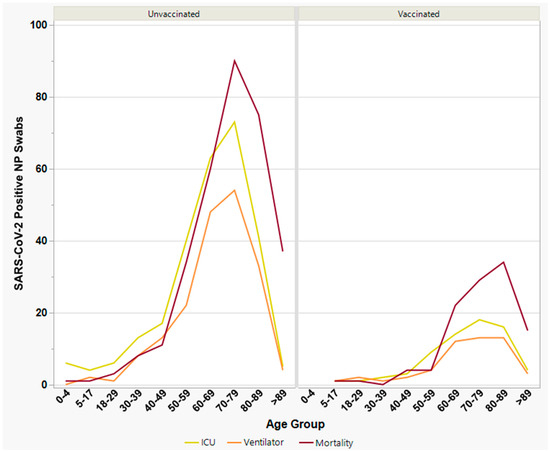 Figure 5 depicts the frequency of severe clinical outcomes by age group among vaccinated vs. unvaccinated individuals, depicting a shift towards higher median ages for vaccinated individuals. Additional outcome-specific factors are discussed separately in the following three sections.