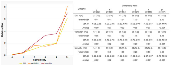 Relationship between total number of comorbidities (comorbidity index) and risk of severe clinical outcome. Yellow line, ICU admission; orange line, ventilator usage; and dark red line, mortality. Comorbidities included cancer, cardiovascular disease, diabetes, hypertension, hyperlipidemia, obesity, respiratory illness, and thyroid disease. Individuals with ≥5 comorbidities were combined due to small sample size. CI, confidence interval; ICU, intensive care unit.