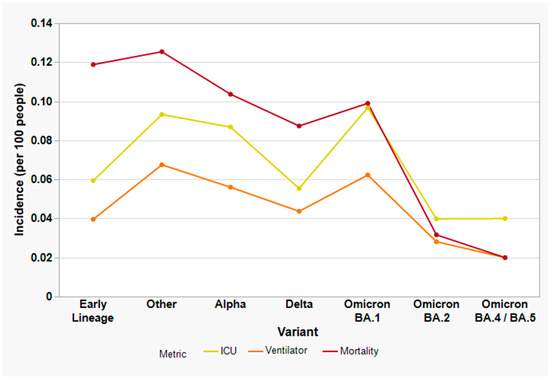 We further ranked the variants by their relative frequencies among each of the clinical outcomes (Figure 7). An overall downward trend in mortality and ventilator usage was observed over time (p < 0.001), corresponding to the temporal progression of distinct variants. However, the Omicron BA.1 wave resulted in a significant increase in all three outcomes, followed by markedly reduced incidences during the BA.2 wave. Overall, infection with earlier variants classified as “Other” was 4.36 times more deadly than the other variants (RRCRUDE = 4.36, 95% CI [1.69, 13.68], p < 0.001) followed by Alpha with a RRCRUDE = 2.72 (95% CI [1.23, 7.85], p = 0.02) and Omicron BA.1 with a RRCRUDE = 2.15 (95% CI [1.01, 6.13], p = 0.07). There was an 89% reduction in mortality during the period when Omicron BA.2 was dominant (RRCRUDE = 0.11, 95% CI [0.04, 0.35], p < 0.001]).