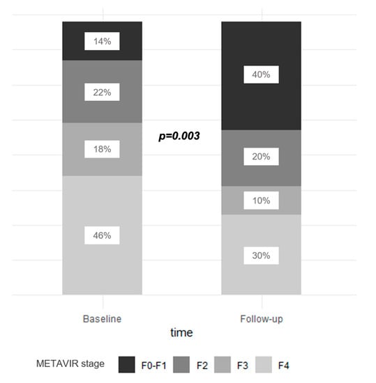The distribution of liver fibrosis at the baseline and during the follow-up in patients who achieved SVR is represented in Figure 1.
